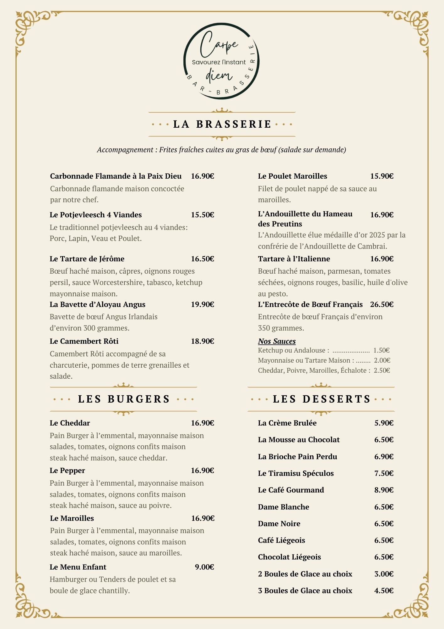 Vous pouvez dès aujourd'hui réserver votre instant gourmand en nous appelant au 06 19 30 65 30.Nous avons hâte de vous accueillir au sein de notre établissement le "Carpe Diem" au 83 Route nationale à Jenlain.