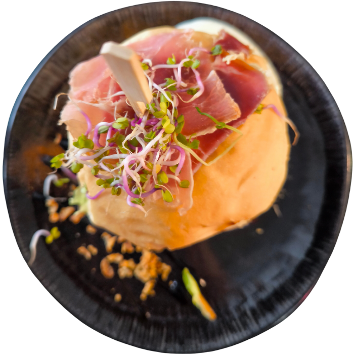 Bœuf haché maison, parmesan, tomates séchées, oignons rouges, basilic et huile d’olive au pesto.
